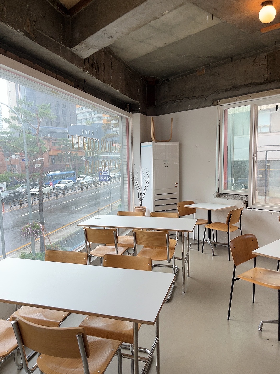 전체적으로 화이트와 우드톤이 편안함을 주는 분위기이고 이렇게 테이블과 의자가 다양한 섹션으로 나눠져서 배치되어 있었습니다.