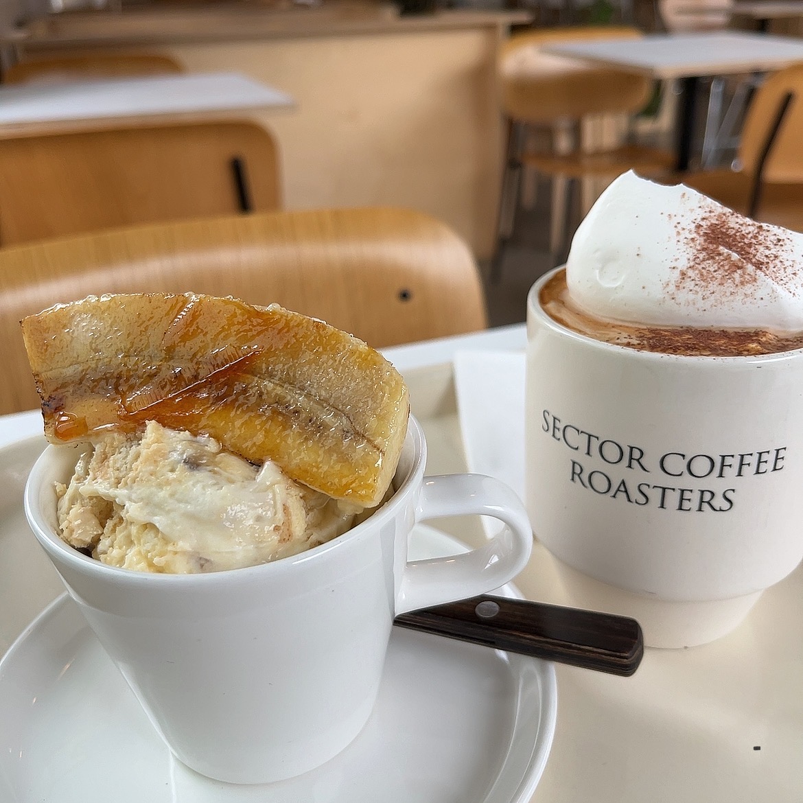 이곳 시그니처인 크림 라떼! 그리고 바나나 푸딩입니다.
